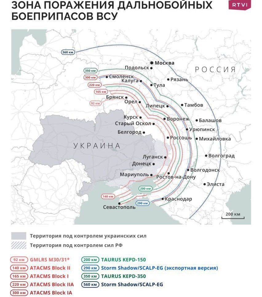 RTVI-ն ներկայացրել է խորությունը քարտեզի վրա` ըստ հրթիռների հեռավորության և ստացվում է, որ արևմտյան հեռահար զենքերի թիրախում կարող է հայտնվել նաև Մոսկվան։
